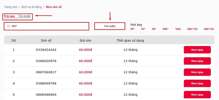 • Bước 3: Chọn loại Sim Trả Trước hoặc Trả Sau > Nhấp chọn vào ô Tìm kiếm sốnhập số bạn muốn mua > Nhấn Tìm kiếm.