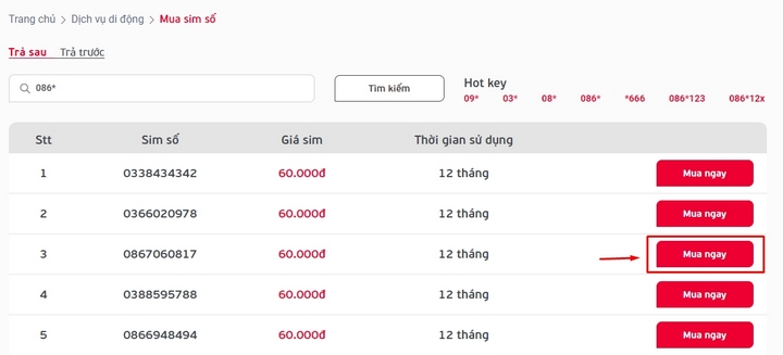 • Bước 4: Chọn Sim mà bạn ưng ý nhất > Chọn Mua Ngay
