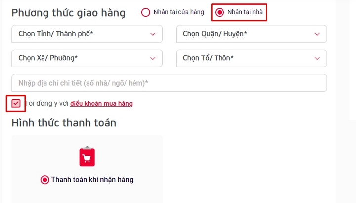 • Bước 7: Nhập thông tin Địa chỉ giao hàng > Tích vào ô Tôi đồng ý với điều khoản mua hàng > Chọn Thanh toán như vậy là xong.