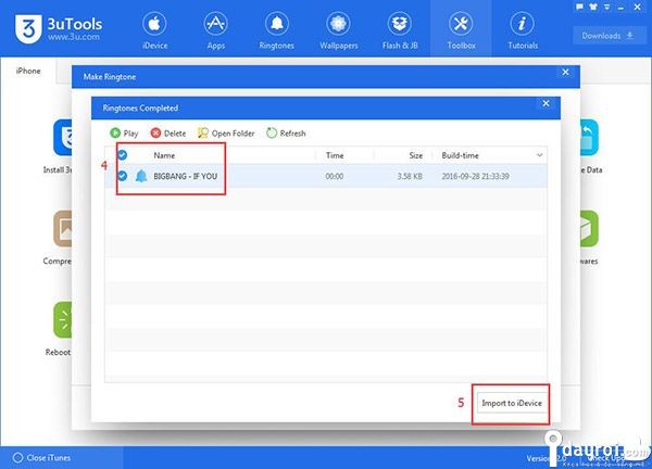 Click vào ô Ringtones (đã được tạo ở trên) và click Import to iDevice, sau đó hãy ngồi đợi giây lát.