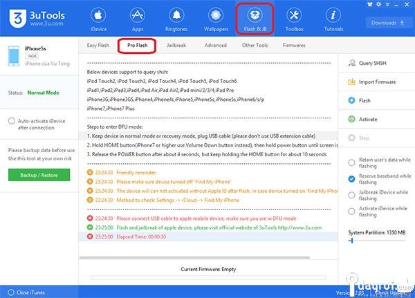 Bạn có thể click vào Flash & JB chọn Pro Flash > Query SHSH để tìm firmware trên thiết bị iOS của mình có thể flash ngay bây giờ.