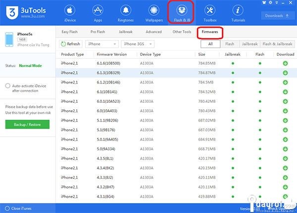 Điểm đáng chú ý là 3uTools có thể tự động lựa chọn firmware tương thích với thiết bị của bạn và sau đó bạn chó phép tải về một trong các tùy chọn có sẵn với tốc độ tải cực kỳ ấn tượng và nhanh chóng.