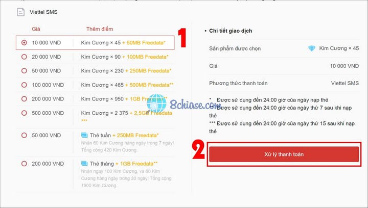 - Bước 2 : Chọn mệnh giá cần nạp > Chọn Xử lý thanh toán.