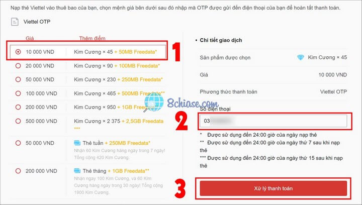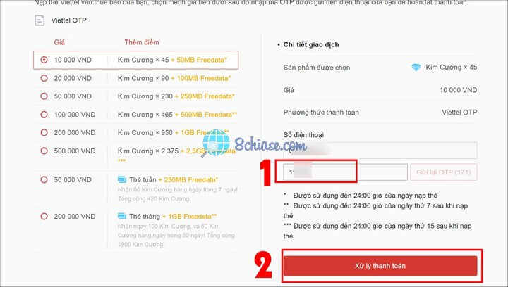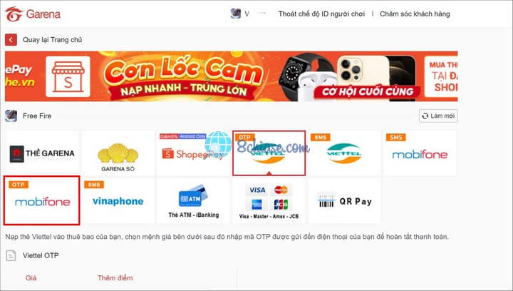 - Bước 1 : Chọn hình thức thanh toán qua mã OTP nhà mạng Viettel hoặc MobiFone mà bạn đang sử dụng.