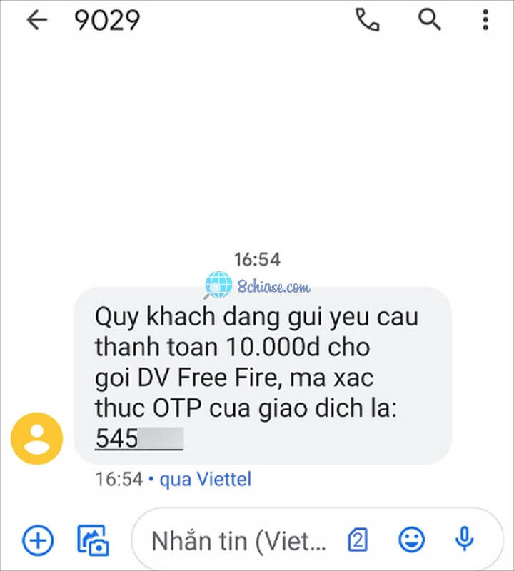 Sau đó, điện thoại bạn sẽ nhận được tin nhắn mã OTP gồm 6 số như hình dưới đây: