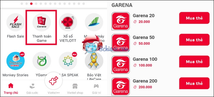 Bạn có thể dùng một số ứng dụng ví điện tử như ViettelPay để thanh toán nạp thẻ bằng cách mua trực tiếp thẻ Garena trên ứng dụng My Viettel và thanh toán với tài khoản ViettelPay. Các thao tác cần thực hiện như sau: