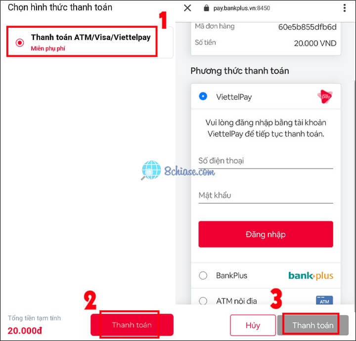 - Bước 2 : Chọn thanh toán qua ATM/Visa/ViettelPay rồi nhấn Thanh toán. Sau đó, bạn hãy chọn phương thức thanh toán là ViettelPay.