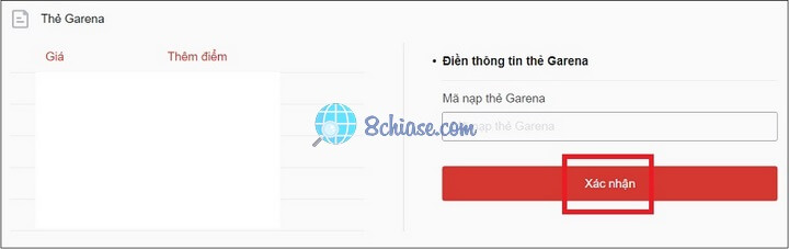 - Bước 3 : Nhập chính xác thông tin mã nạp thẻ Garena mà bạn đã mua vào ô Điền thông tin thẻ Garena > Chọn Xác nhận.