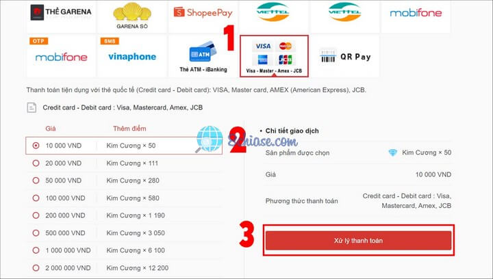 - Bước 1 : Chọn hình thức thanh toán Thanh toán Visa – Master – Amex – JBC > Nhấp chọn mệnh giá cần nạp > Chọn Xử lý thanh toán.