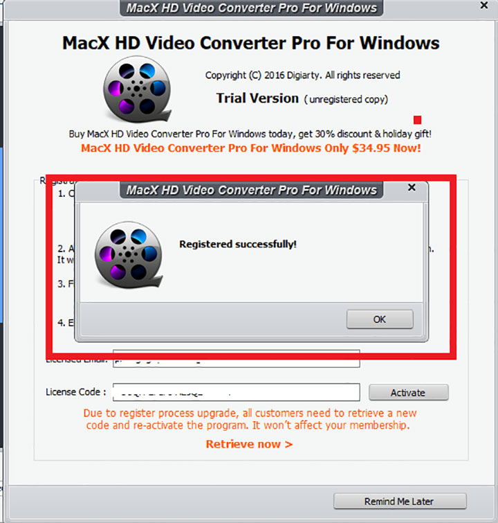 Bước 3: Cài đặt phần mềm và nhập vào mã kích hoạt bản quyền kèm trong file nén MacX Video Converter Pro khi xuất hiện thông báo là xong.
