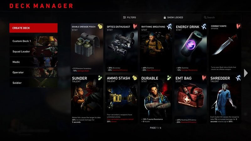 Bên cạnh những lá bài buff thuần chỉ số có trong 4 bộ bài mặc định gồm Medic, Soldier, Squad và Operator, game còn trang bị thêm những lá bài đặc biệt với những kĩ năng đặc biệt. Ví dụ như khi bạn sử dụng hồi máu thì sẽ được tăng 10% tốc độ di chuyển, nạp đạn và thay vũ khí trong vòng 30 giây. Hoặc tăng cường khả năng chống chịu, tăng số lượng thuốc giảm đau mang theo cho toàn đội, hồi sinh người chết…Ngoài ra, game thủ còn có thể tự chế tác ra những bộ bài dành riêng cho mình.