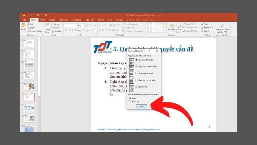 • Bước 5: Tại đây, hộp thoại Send to Microsoft Word hiện lên. Tại Page Layout in Microsoft Word, chọn Notes next to slides => Nhấn OK.