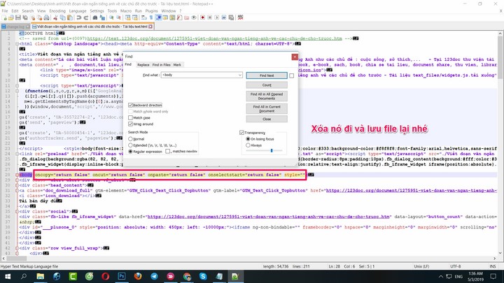 Sau khi lưu xong bạn tiến hành mở file vừa tải về bằng Notepad và tìm xóa đoạn code sau nằm trong thẻ <body bạn nhé : “oncopy=”return false” oncut=”return false” onpaste=”return false” onselectstart=”return false” style=””“