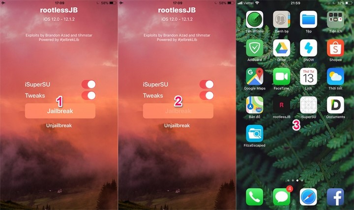 Bước 3 : Khởi chạy ứng dụng rootlessJB3 > nhấn nút Jailbreak > chờ quá trình mở khóa hoàn tất là xong.