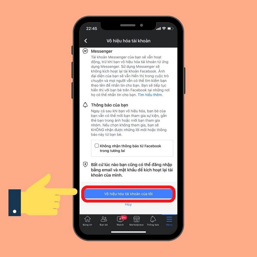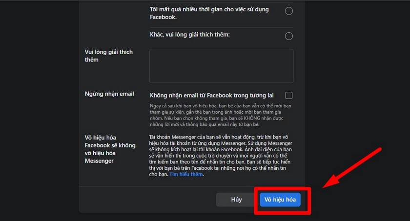 - Bước 8: Chọn vào mục Vô hiệu hóa tài khoản là xong rồi đó.