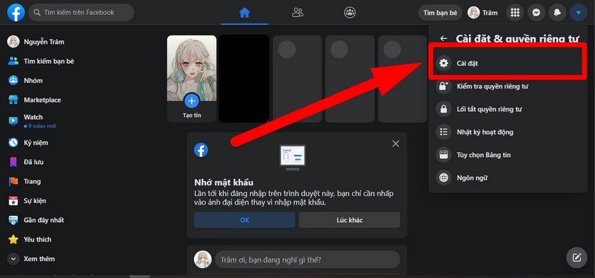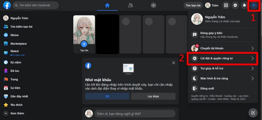 - Bước 1: Trên giao diện chính của Facebook, bạn click vào biểu tượng hình tam giác ngược ở góc phải màn hình > Chọn vào mục Cài đặt và quyền riêng tư.