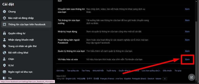 - Bước 3: Ở trong phần này, bạn ấn vào mục Thông tin của bạn trên Facebook > Trên mục Vô hiệu hóa và xóa ở bên phải màn hình, bạn ấn vào Xem.