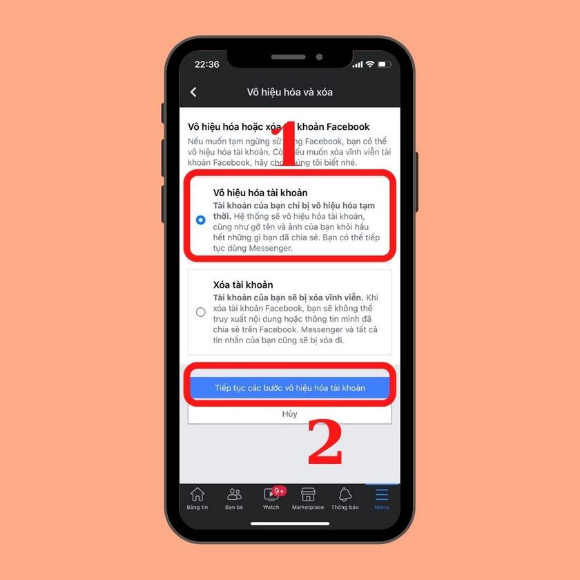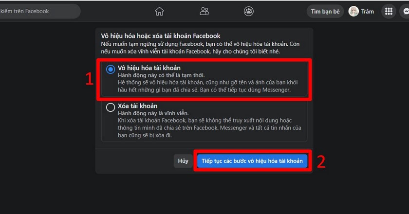 - Bước 4: Đánh dấu tích vào ô Vô hiệu hóa tài khoản > Click chọn Tiếp tục vô hiệu hóa tài khoản.
