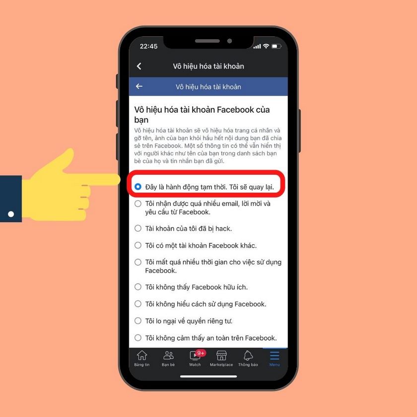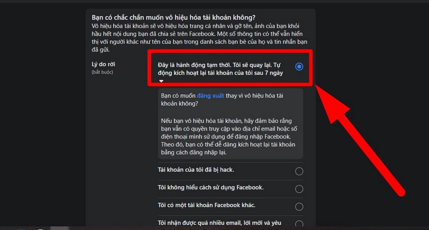 - Bước 5: Ở mục lý do rời Facebook, bạn chọn “Đây là hành động tạm thời. Tôi sẽ quay lại”.