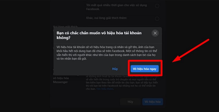 - Bước 7: Một thông báo xuất hiện xác thực lại “Bạn có chắc chắn muốn vô hiệu hóa tài khoản của mình không?” > Nhấn Vô hiệu hóa ngay là hoàn tất.