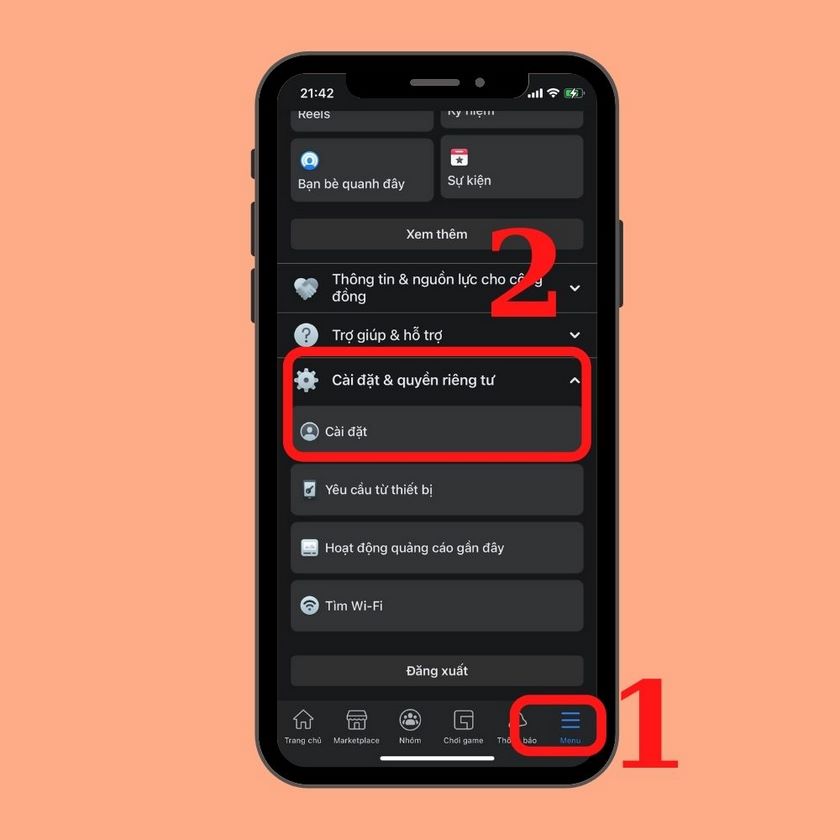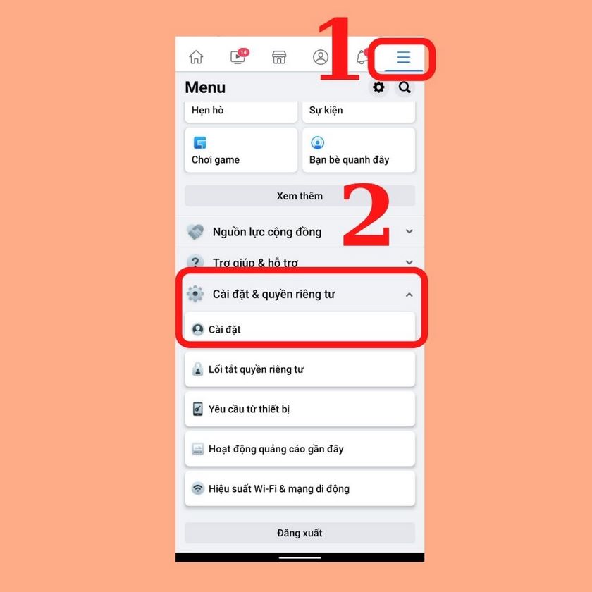 - Bước 2: Bấm vào dấu 3 gạch ở góc phải dưới của màn hình > Nhấp vào mục Cài đặt & Quyền riêng tư > Click tiếp vào mục Cài đặt.