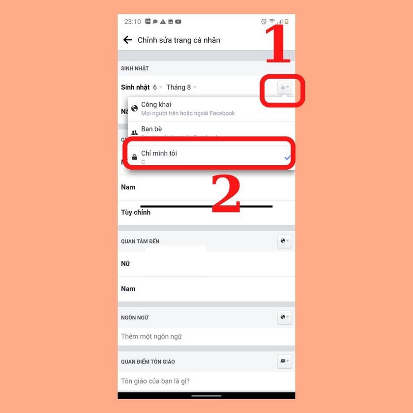 - Bước 3: Trong phần Chỉnh sửa trang cá nhân, ở các mục Sinh nhật, nơi sinh,… bạn nhấn vào biểu tượng kế bên những mục trên > Chọn vào chế độ chỉ mình tôi.