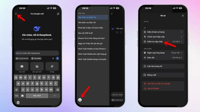 Sau cùng, bạn có thể đính kèm file (tệp văn bản, hình ảnh, video…) như dữ liệu cho DeepSeek có câu trả lời chính xác, chi tiết hơn. Bạn cũng có thể kiểm tra lại lịch sử chủ đề trò chuyện bằng cách nhấp vào biểu tượng 2 gạch ngang ở góc trái trên cùng. Ngoài ra, bạn nên thường xuyên vào Tài khoản > Kiểm tra cập nhật để thường xuyên cập nhật DeepSeek lên bản mới nhất.