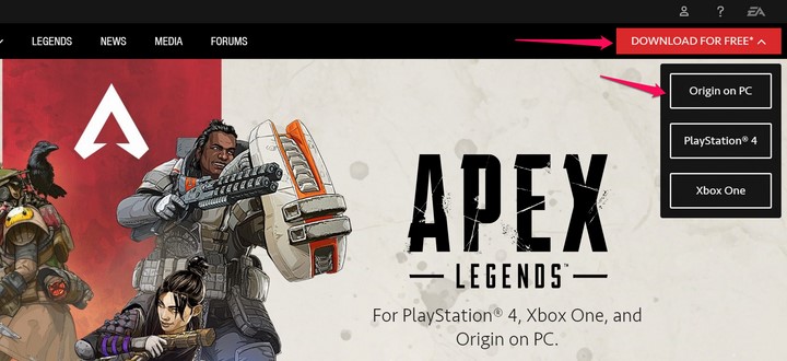 Bước 1 : Truy cập vào trang chủ của nhà cung cấp game Apex Legends nhấn vào “Download For Free“và chọn tiếp “Origin on PC” để tiến hành tải file cài đặt Origin về PC của mình .