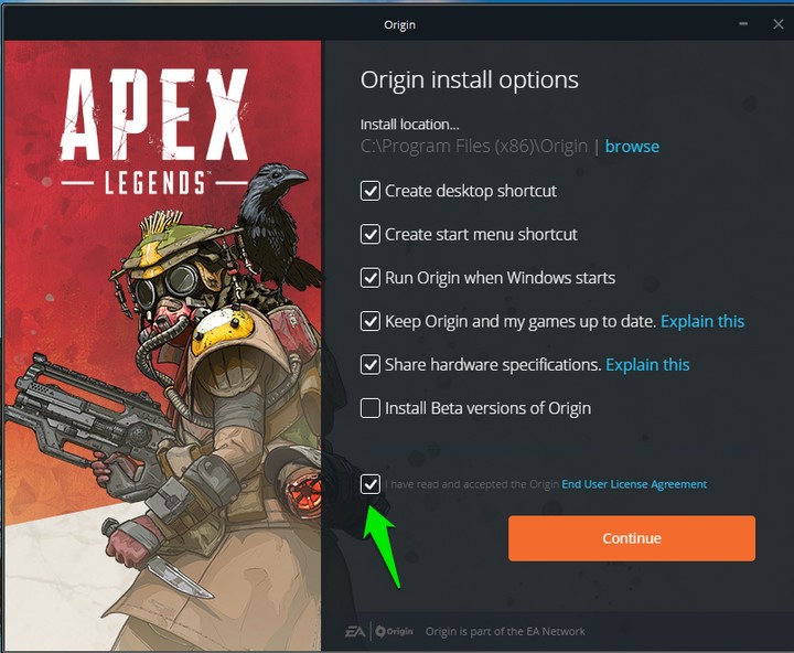 Tích chọn các điều khoảng Origin và bấm “Continue“.