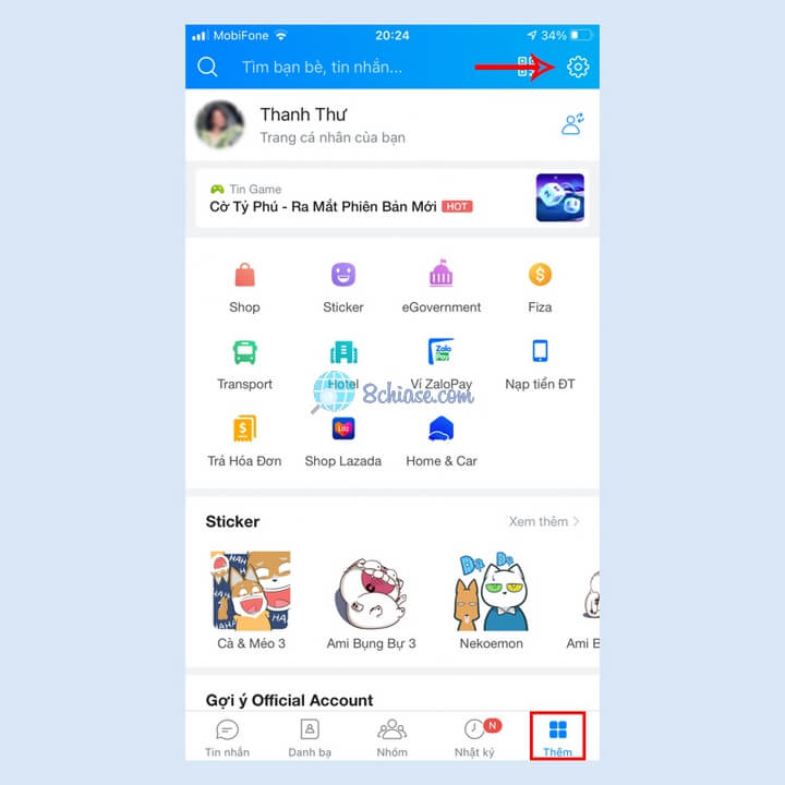 - Bước 1 : Mở ứng dụng Zalo lên chọn Thêm sau đó chọn cài đặt biểu tượng bánh răng cưa phía trên góc trài màn hình.