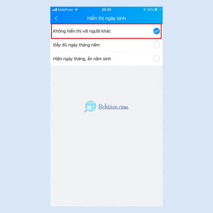 - Bước 3 : Chọn Không hiển thị với người khác điều này sẽ ngăn không cho Zalo gửi thông báo sinh nhật của bạn đến người khác.