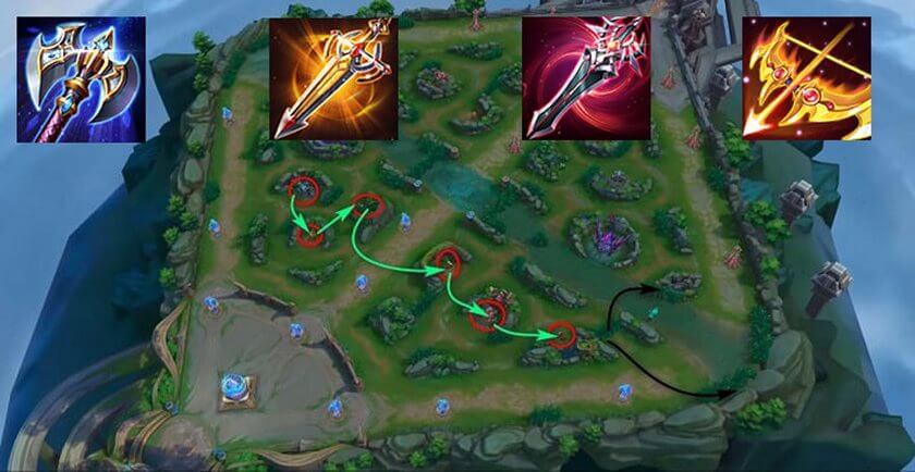 Lưu ý: khi mới vào trận đấu, hãy lên món đồ Rựa Thợ Săn để farm quái nhanh hơn cũng như có nhiều vàng và kinh nghiệm hơn khi kết liễu quái rừng. Cố gắng hoàn thiện món trang bị đi rừng cấp 2 hoặc cấp 3 càng nhanh càng tốt để nâng cấp phép phụ trợ Trừng Trị thành Tê Tái.