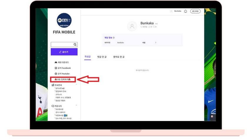 - Truy cập trang web nhập code FIFA Mobile Hàn Quốc chính thức tại đây, sau đó Sau đó, các bạn chọn mục có biểu tượng 2 chiếc chuông màu đỏ ở phần danh mục bên trái màn hình.