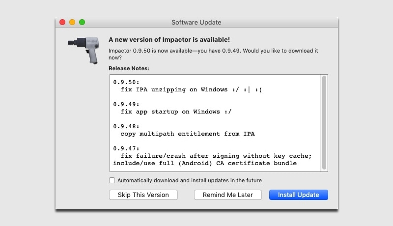 Sau khi ra mắt phiên bản Cydia Impactor v0.9.49 không lâu Saurik tiếp tục cập nhật phiên bản mới với tên Cydia Impactor v0.9.50 để khắc phục lỗi không thể giải nén file cài đặt ứng dụng iOS trên máy tính Windows đây là lỗi được nhiều người phản hồi trong tuần qua.