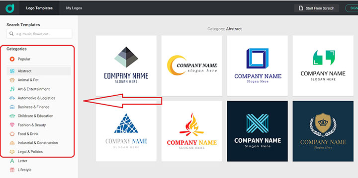 Bước 2 : Bạn sẽ được chuyển đến giao diện Make a Logo tại đây sẽ có thanh menu các chủ đề như Nghệ thuật & Giải trí, Trừu tượng, Kinh doanh & Tài chính, Giáo dục, Thời trang & Làm đẹp, Công nghệ, Đời sống, Truyền thông, Du lịch hay Lối sống v.v…