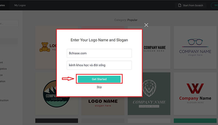 Bạn hãy chọn cho mình một chủ đề và tiếp tục chọn một mẫu logo có sẵn sau đó hãy nhập các thông tin Tên (thương hiệu, doanh nghiệm, công ty, cá nhân) và Slogan, sau đó nhấn nút “Get Started” để bắt đầu quá trình khởi tạo logo.