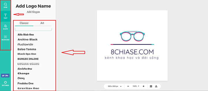 Bước 3 : Logo của bạn đã được tạo thành công tại đây ở thanh menu bên trái cũng có những chức năng để bạn chỉnh sữa lại logo cho phù hợp với ý muốn của mình như (font chữ, kích thước, kiểu hiển thị v.v…), hình dạng và nền logo.