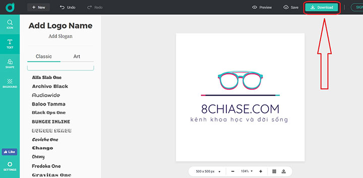 Bước 4 : Khi bạn cảm thấy hài lòng với logo mình vừa tạo hãy nhìn lên góc phải màn hình và nhấn vào nút “Download” để tải về file thiết kế dưới định dạng JPG hoặc PNG.