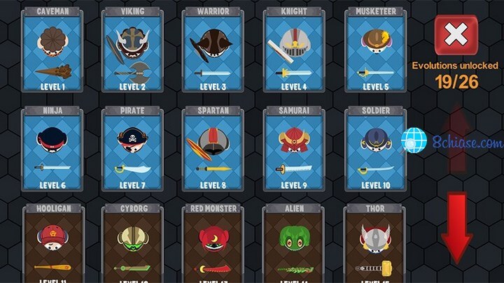 Điểm nhấn ấn tượng nhất trong trò chơi EvoWars.io đó chính là các chiến binh sau khi tích lỹ đủ điểm kinh nghiệm được thể hiện bởi thanh kiếm hiển thị trên màn hình, sẽ thăng cấp, thay đổi hình dạng, kích thước. Điều này sẽ giúp gia tăng phạm vi tấn công cũng như tốc độ tấn công của chiến binh cũng được nhanh hơn. Bên cạnh đó tốc độ di chuyển của chiến binh sẽ giảm dần khi thăng tiến cấp độ.