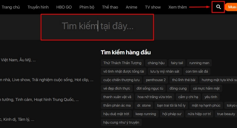 - Bước 2: Nhấp vào ô tìm kiếm (icon Search ) > Nhập tên phim muốn xem vào ô tìm kiếm > Nhấn Enter.