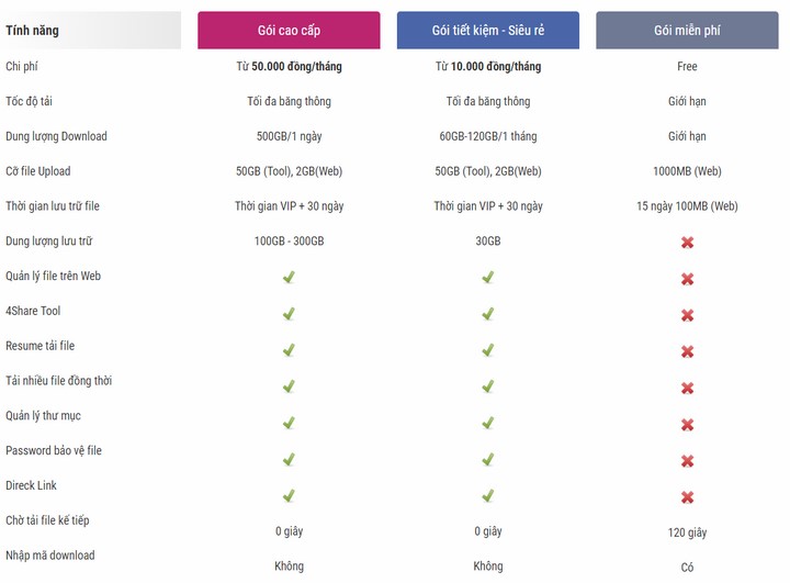 - VIP User: có không gian lưu trữ riêng lên tới 300 Gigabyte, và có thể upload, download tài nguyên 4Share.vn với tốc độ không giới hạn.