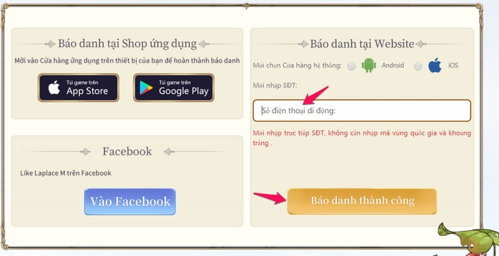 Chọn cửa hàng hệ thống Android hoặc là iOS . Sau đó điền số điện thoại của anh em vào và Click “Báo Danh Thanh Công“