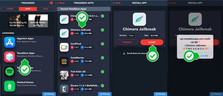 Bước 2 : Tại giao diện chính của Ignition, bạn chuyển sang tab Apps > chọn Jailbreak > Tìm kiếm Chimera > Nhấn nút Install và xác nhận Cài đặt.