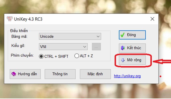 Bước 2 : Mở phần mềm Unikey và click vào phần “mở rộng”