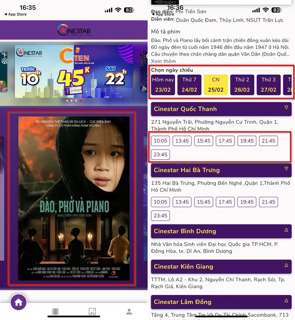 Sau đây chính là lịch chiếu phim Đào, Phở và Piano tại các rạp phim Cinestar trên toàn quốc mới nhất để bạn tiện theo dõi và đặt mua vé ngay: