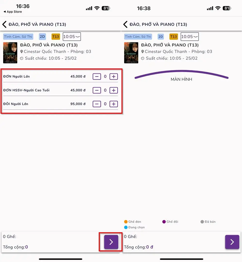 - Bước 3: Tiếp đến, bạn chọn số lượng vé phù hợp và chọn biểu tượng mũi tên để chuyển sang bước tiếp theo > Bạn tiến hành chọn ghế và tiến hành thanh toán để hoàn tất sở hữu cho mình vé xem.