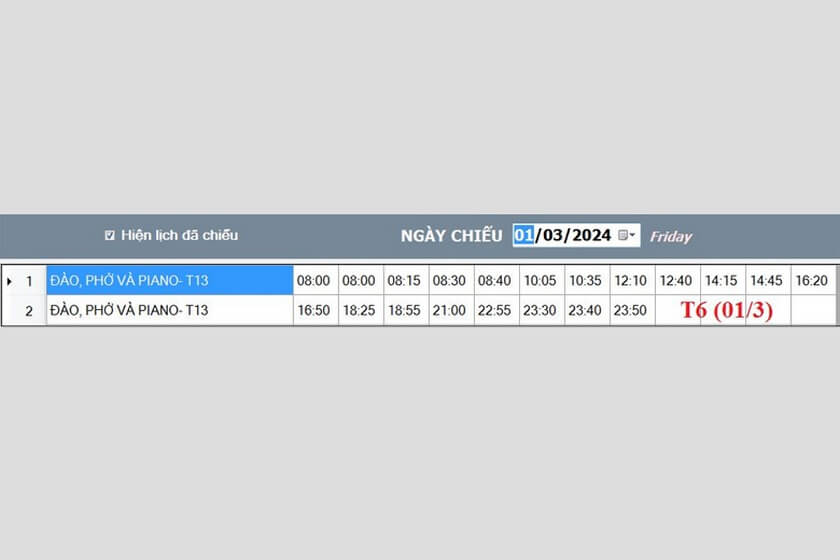 Trang fanpage chính thức của Trung tâm Chiếu phim Quốc gia đã công bố lịch chiếu phim “Đào, Phở, Piano”. Để tiện theo dõi, bạn hãy xem qua dưới đây nhé: