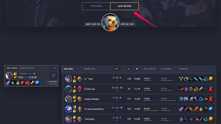 Nhấp qua tab “Lịch sử thi đấu” website sẽ liệt kê một cách chi tiết các vị tướng và những trận đánh mà người chơi đã trải qua.