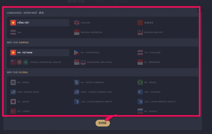 Mặc định khi vào nó sẽ chuyển thẳng tới máy chủ của Việt Nam cho bạn do đó bạn muốn đổi máy chủ thì nhấp vào “Máy chủ” và chọn máy chủ mà mình muốn kiểm tra. Hoặc click vào mục ngôn ngữ ở góc trái trên cùng để đổi sever củng được .