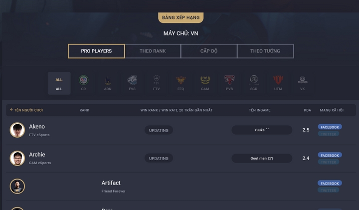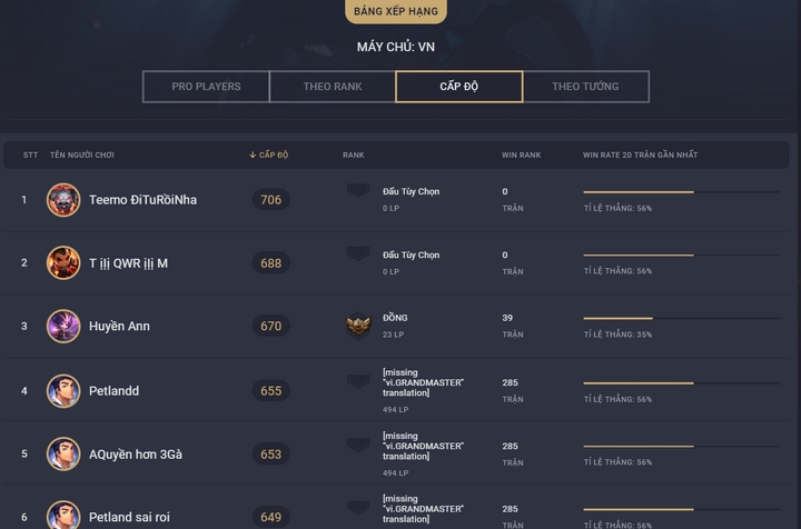 Bạn hoàn toàn có thể tra cứu bảng xếp hạng người chơi một cách đơn giản theo nhiều bộ lọc khác nhau như “Pro Player” “Cấp Độ” “Tướng”